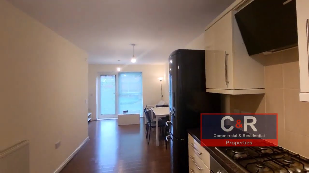 UPVC window to front. Laminate flooring. High gloss kitchen finished in cream with a range of floor and wall units and dark wood effect work tops and cream splash back tiles. Integrated gas hob, oven with extractor over, Inset sink with chrome mixer tap. Plumbing and space for washing machine. Ideal combination boiler. Fuse box, range of power points, ceiling light point. Radiator.